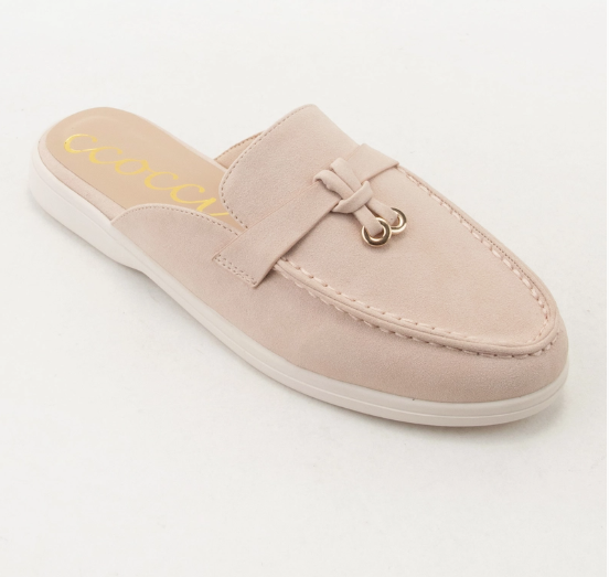 Step into fun with the Irene Know Mule! This slip-on loafer mule features a chic circular metallic charm on a ribbon and a trendy cut-away lip for extra flair. The moccasin stitching and almond toe blend classic style with a modern twist. Enjoy all-day comfort thanks to the lightly padded footbed and vegan-friendly faux nubuck leather lining. Finished with a crisp white rubber outsole and a perfect 1.1" heel, these mules are ready to elevate your look with playful ease. The color offers the slightest blush undertone for a beautiful, versatile slip on.