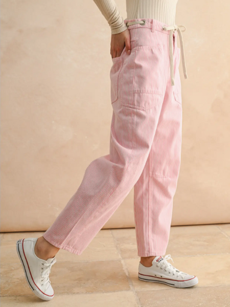 Elevate your denim collection with these refined Pinky Barrel Jeans, featuring distinctive pink stripes. The barrel cut delivers a modern, relaxed fit through the hip and thigh, tapering subtly at the ankle for a polished finish. Functional tie detailing and secure button closure ensure both style and practicality. Perfect for effortless sophistication, whether dressed up with heels or down with sneakers.