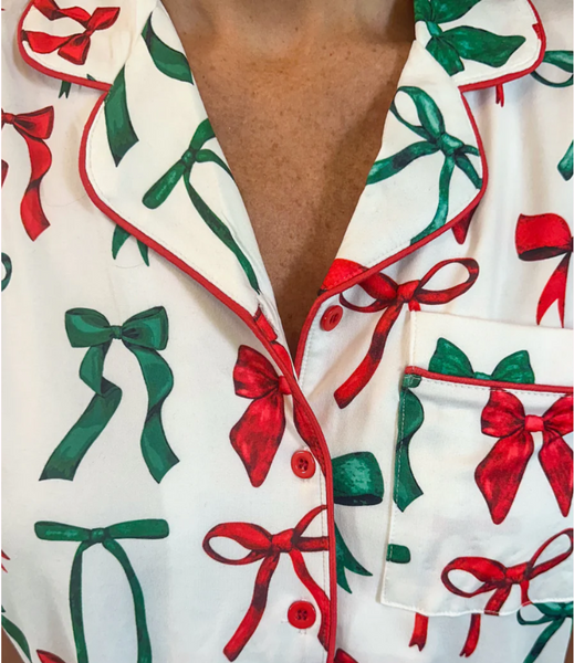 Slip into holiday comfort with the Goodnight Bow PJs—a charming ruffle pajama set that brings festive cheer to bedtime. The short-sleeve top and long pants feature playful red and green bows that capture the warmth and joy of the season. Crafted from a soft, stretchy blend of 95% polyester and 5% spandex, this set offers the perfect balance of coziness and flexibility for restful nights. Whether you're settling in for a winter's nap or creating memorable moments with loved ones, these delightful pajamas transform ordinary evenings into something special. Embrace the holiday spirit in style and comfort.